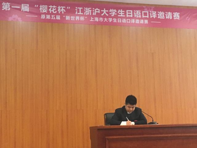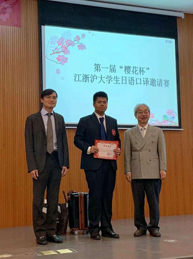 6月8日,第一届“樱花杯”江浙沪大学生日语口译邀请赛在杭州师范大学仓前校区隆重举行,来自上海外国语大学、复旦大学、同济大学、浙江大学等江浙沪23所高校的日语专业本科生、研究生选手参加了比赛。东京学艺大学名誉教授松冈荣志、浙江省人民政府外事办公室王敏老师、上海中日校企联盟会叶维英会长、上海外国语大学徐旻副教授和杭州师范大学王忻教授担任本次邀请赛评委。十大信誉网赌澳门十大信誉网赌大全日语翻译专业2018级研究生陈涛同学代表十大信誉网赌参赛,经过激烈角逐,以出色的表现荣获本次邀请赛特等奖。