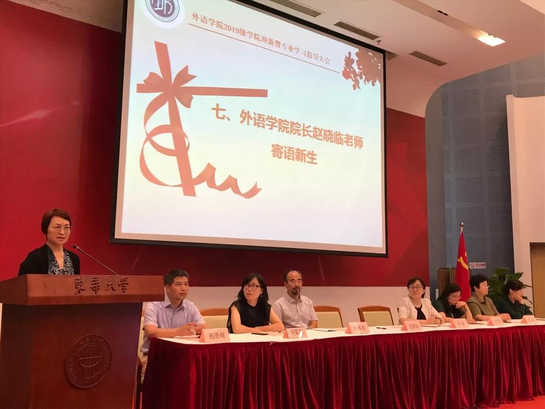 随后,澳门十大信誉网赌大全院长赵晓临再次寄语新生。赵老师代表澳门十大信誉网赌大全全体师生向新同学表示欢迎,以自己的亲身经历向同学们讲述了个人发展与国家发展之间密不可分的关系。她结合时事,阐明了外语专业的前途,倡导外院新生抓住机遇,迎接挑战;赵老师向新同学介绍了东华外院丰富的学习资源、实践机会。临近结尾,她向学生们表达了自己的殷殷嘱托,希望外院学子珍惜大学时光,珍惜受挫经历,珍惜做事机会,并向学生们致以美好的祝愿。