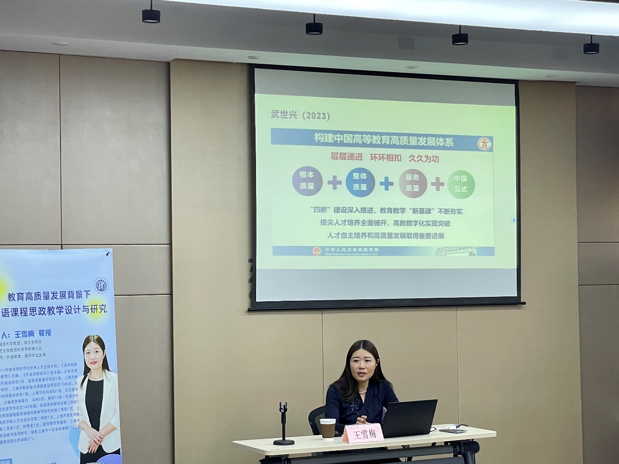 张曦向王教授致以诚挚的感谢。她指出,王教授的报告开拓了学院教师的课程教学设计思路,展现了多样化的教学手段以及紧密围绕国家战略和时代要求的教学内容。学院将继续致力于通过思政教学,培养具备家国情怀和全球视野的外语人才,以思政为契机,促进外语学科的创新发展,实现课程内容与教育目标的有机融合。