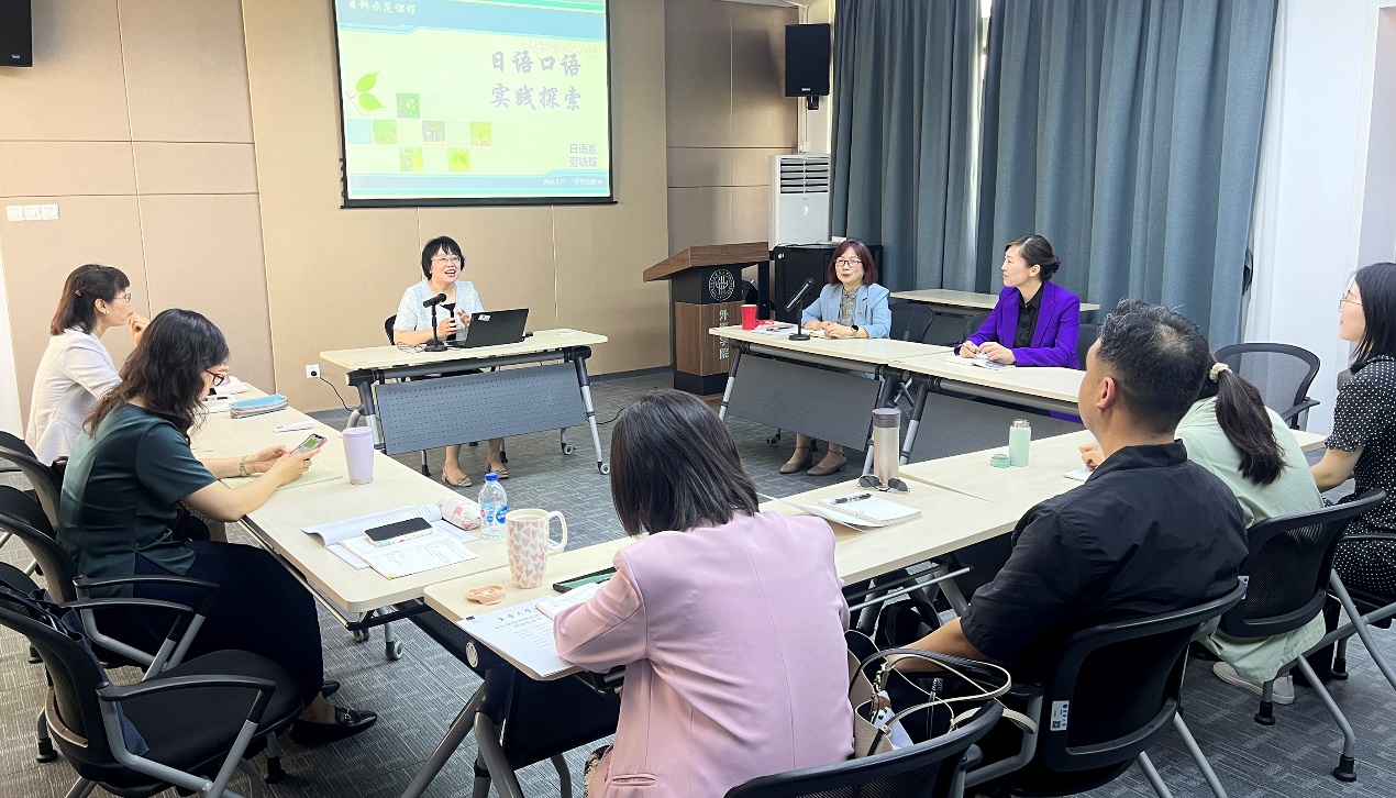 校第二届本科教学示范岗劳轶琛介绍了《日语口语实践》示范课程的建设过程和实践经验。该门课程以线上、线下结合的模式,同时通过与国际院校合作的方式,创建真实的语言环境供学生学习和磨练,打破课堂教学的壁垒,实现教学模式和教学评估的多元化角度;充分调动学生的学习积极性,促进师生互动、生生互动;教学理念突出以“学生为主、实践先行、教师指导”,评价系统创新评价与反馈机制,整合多渠道、多维度、多参与者的评价体系,达成评价者、评价方式、评价载体多元化。