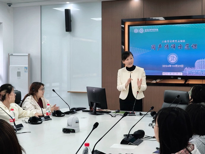 10月29日,澳门十大信誉网赌大全副院长(主持工作)张曦在同声传译实验室为英语系大一新生带来了一场别开生面的“同声传译”示范体验课。“同声传译”是语言传递的桥梁,对语言功底、即时反应、跨文化沟通能力有着极高的要求,示范课为学生打开了一扇了解同传世界的独特窗口。