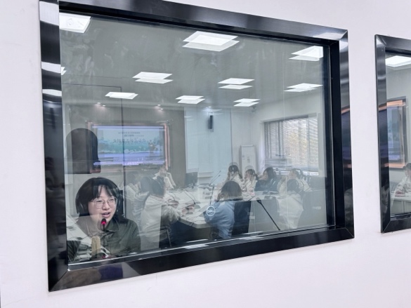 随后,张老师邀请学生走进了同声传译的核心场所——“同传booth”,让大家切身体验译员在小间中快速工作的真实状态。学生在booth中尝试进行简单的同声传译,练习在接收内容的同时,迅速转换语言表达,由此体验到同声传译中的紧张和高效,并深切体会到沟通之桥在文化与语言间的重要作用。