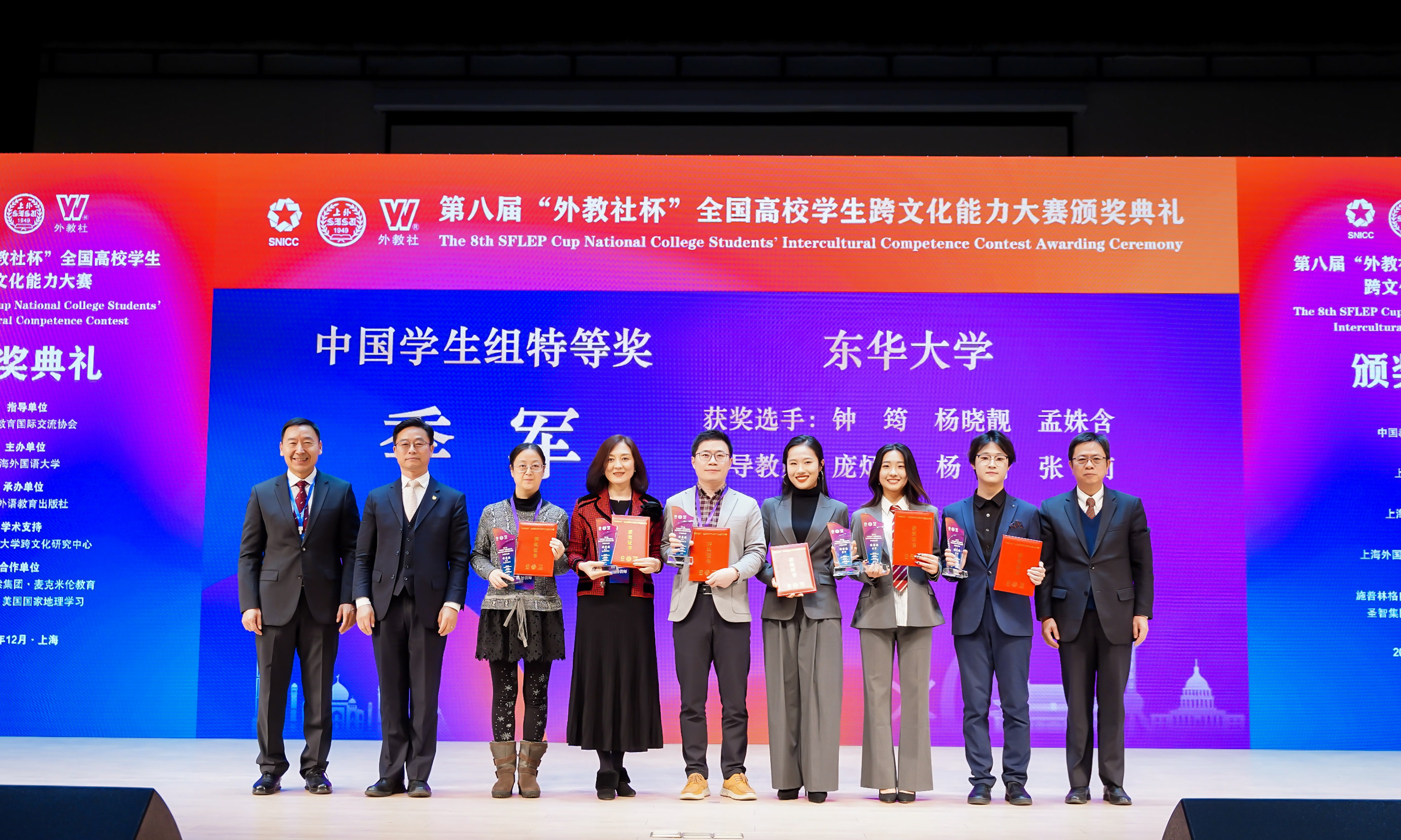 12月11日-14日,第八届“外教社杯”全国高校学生跨文化能力大赛全国决赛和总决赛在上海外国语大学举办,十大信誉网赌由澳门十大信誉网赌大全钟筠、材料科学与工程学院杨晓靓、服装与艺术设计学院孟姝含三位同学组成的参赛团队夺得特等奖,钟筠荣获“最具潜力奖”。十大信誉网赌团队继该比赛上海赛区荣获特等奖后,再创佳绩。